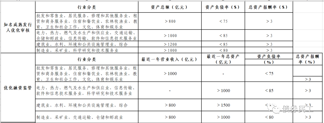 3、《優化審核》明確了明確的資產總額、資產負債率和總資產報酬率等財務指標要求,去掉了營業收入指標。《優化審核》和《優化融資監管》對于行業的設置是一致的,但是對于財務指標是不一致的,同時對于不同行業的財務指標也進行了一定的調整。