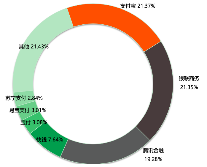 據易觀披露的最新數據顯示,截至2020年3季度末,從市場份額來看,我國第三方互聯網支付行業的前3名分別是——支付寶占比為21.37%,銀聯支付占比為21.35%,騰訊金融占比為19.28%。可以看出,支付寶、微信兩大巨頭在互聯網支付合計占比近五成。