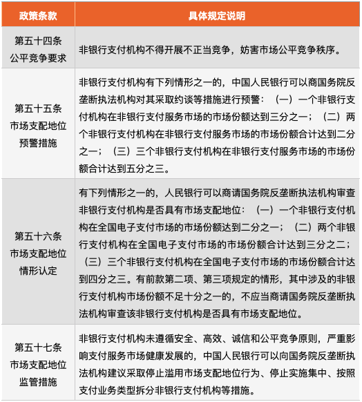 從《條例》具體條款來看,零壹智庫發現,2個細則最能體現“強監管”導向——第一項是第3章的支付業務規則,強化對于非銀行支付機構的監管,例如:將支付業務明確劃分為儲值賬戶運營和支付交易處理兩類,進而適應技術和業務創新的需要;第二項是第4章的監督與管理,其中54-57這四個條款重點強調了非銀行支付機構的反壟斷問題,明確指出“兩個非銀行支付機構在非銀行支付服務市場的市場份額合計不可達到二分之一”,否則會觸發預警措施。