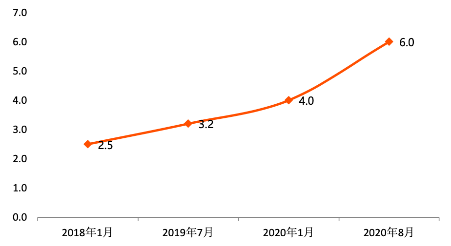 近三年,抖音日活躍用戶數量不斷加速上升。從2018年1月的2.5億人,提升到2020年8月日活躍用戶量6億人,標志其成為高流量的互聯網頭部平臺之一,自身的品牌影響力更大。