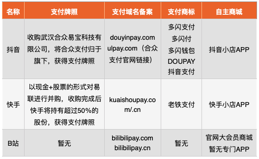 我國短視頻行業已形成三巨頭——抖音、快手和B站,它們在入局支付市場的進程上,前2家基本完成了對于支付牌照、支付域名備案、支付商標以及自主商城等四個方面的部署;然而,B站的支付腳步遠慢于其他兩個平臺。