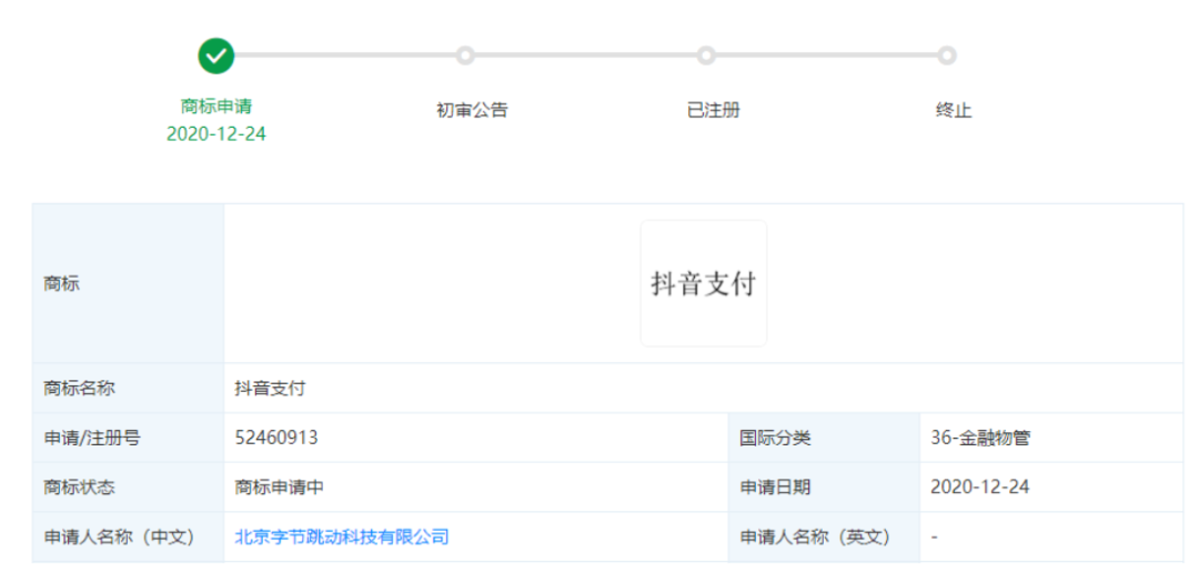 同時,字節跳動在2020年12月24日新增了“抖音支付”的商標信息,國際分類為36-金融物管,商標狀態為商標申請中。此前,2019年7月25日,字節跳動第一次申請36-金融物管類支付商標但被駁回。