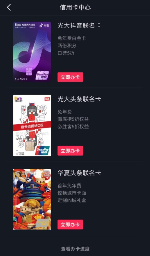 一是在拓展銀行合作伙伴方面,抖音支付支持綁定農業銀行、建設銀行、中國銀行、郵儲銀行、交通銀行、招商銀行等銀行的銀行卡。此外,抖音與光大銀行和華夏銀行聯合推出聯名信用卡,逐步提升品牌知名度。