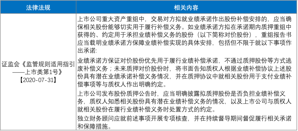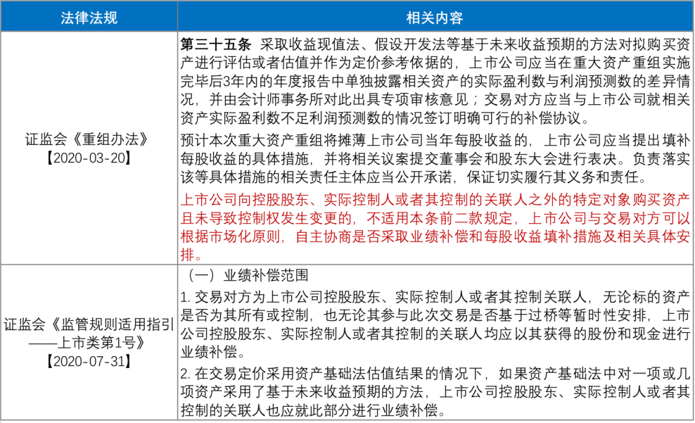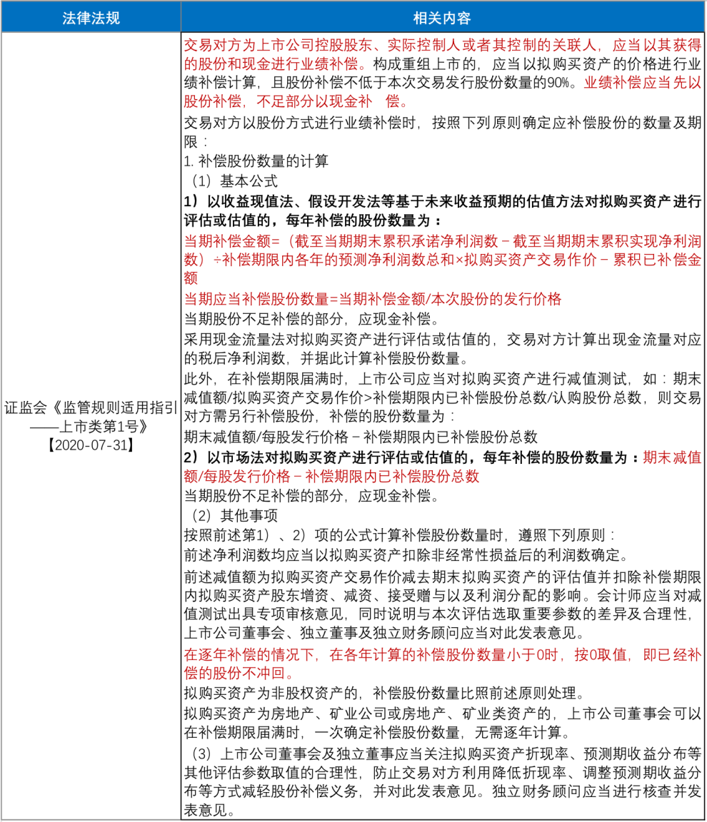與盈利預測補償有關的規定主要見于證監會《重組辦法》、證監會《監管規則適用指引——上市類第1號》。我們將相關規定整理如下: