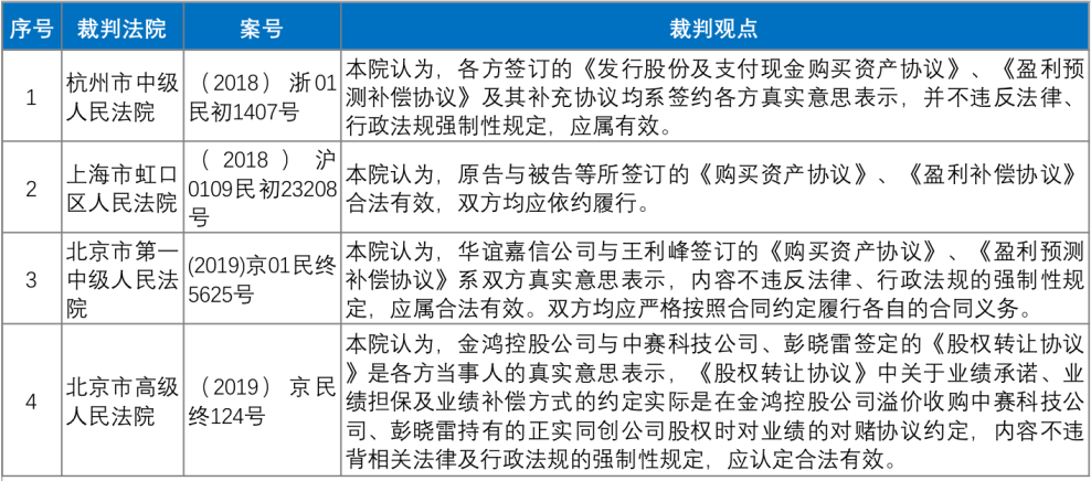 當前,主要由標的公司股東或實際控制人作為交易相對方與上市公司簽訂盈利預測補償協議,針對該種情形下盈利預測補償協議效力的認定,人民法院以《中華人民共和國合同法》(下稱“《合同法》”)第五十二條作為審查依據,盈利預測補償協議只要系簽約各方真實意思表示且不違反法律、行政法規強制性規定即為有效。相關裁判觀點如下: