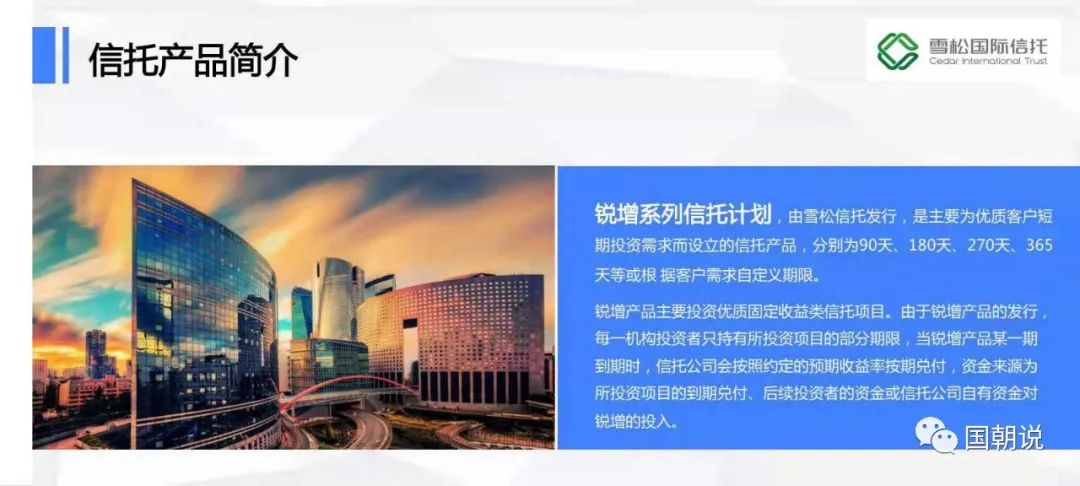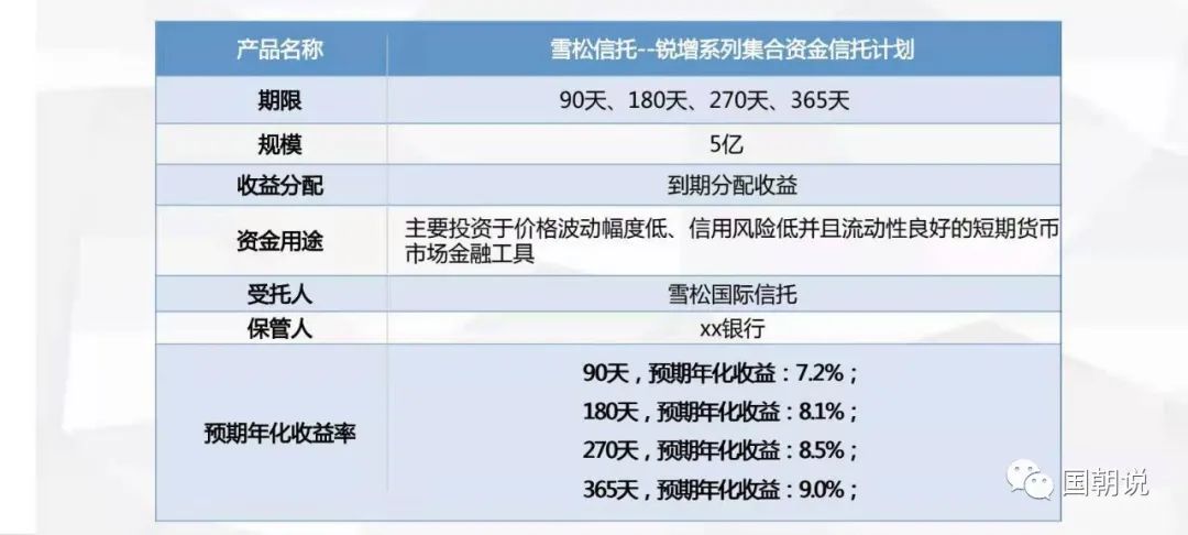 根據信托公司推介資料顯示,該產品名為銳增系列信托計劃,由雪松信托發行,是主要為優質客戶短期投資需求而設立的信托產品,分別為90天、180天、270天、365天等或根據客戶需求自定義期限,預期收益7.2%-9%。