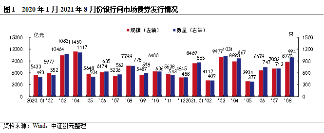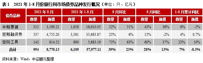 2021年8月,我國(guó)銀行間市場(chǎng)共發(fā)行信用債券994只,發(fā)行規(guī)模8,770.13億元,環(huán)比分別上升39%和23%,同比分別上升28%和13%。綜合1-8月來(lái)看,銀行間市場(chǎng)發(fā)行信用債券6,109只,發(fā)行規(guī)模57,977.11億元,比2020年同期發(fā)行數(shù)量和規(guī)模分別上升7%和下降0.3%。