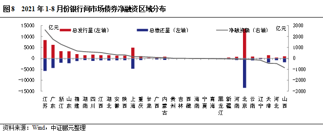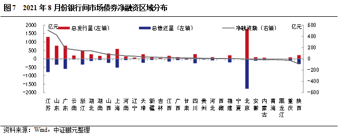 區(qū)域分布方面,8月銀行間市場(chǎng)債券發(fā)行人主要分布在北京及東部沿海地區(qū),北京以1,770.91億元位居發(fā)行規(guī)模第一位;8月表現(xiàn)為凈融資省份共23個(gè),江蘇、山東、廣東分別以?xún)羧谫Y508.09億元、425.42億元、183.60億元排名前三位。其中,共有7個(gè)省份呈凈償還,區(qū)域主要分布在北方地區(qū)和重慶。