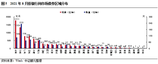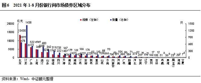 2021年8月份,銀行間市場(chǎng)債券廣泛分布于29個(gè)省(直轄市、自治區(qū))。從發(fā)行規(guī)模來(lái)看,北京以1,770.91億元的發(fā)行規(guī)模遙遙領(lǐng)先,江蘇、廣東、山東、上海和浙江位列第二梯隊(duì),發(fā)行規(guī)模在500-1,500億元之間。從發(fā)行數(shù)量來(lái)看,江蘇排名第一、北京排名前二,山東、浙江、廣東、上海發(fā)行數(shù)量緊隨其后,均超過(guò)40只。綜合2021年1-8月的情況來(lái)看,銀行間市場(chǎng)債券的發(fā)行主導(dǎo)區(qū)域仍集中在北京、江蘇和廣東等地區(qū)。從發(fā)行規(guī)模來(lái)看,北京以1,3430.15 億元的發(fā)行規(guī)模領(lǐng)先于其他省市,江蘇、廣東和上海緊隨其后。從發(fā)行數(shù)量來(lái)看,江蘇發(fā)行1,438只,位居第一;北京發(fā)行678只,位居第二;廣東發(fā)行522只,位列第三。