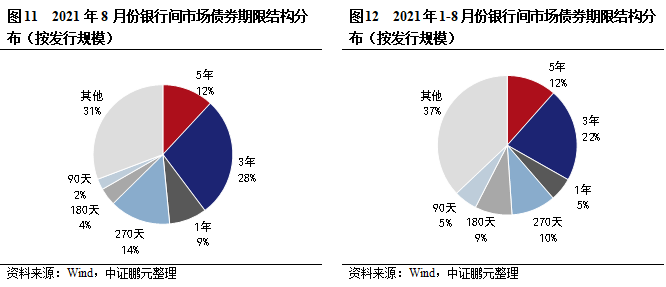 五、8月銀行間市場(chǎng)債券期限集中度同比下降,主要期限的發(fā)行規(guī)模占比較7月上升