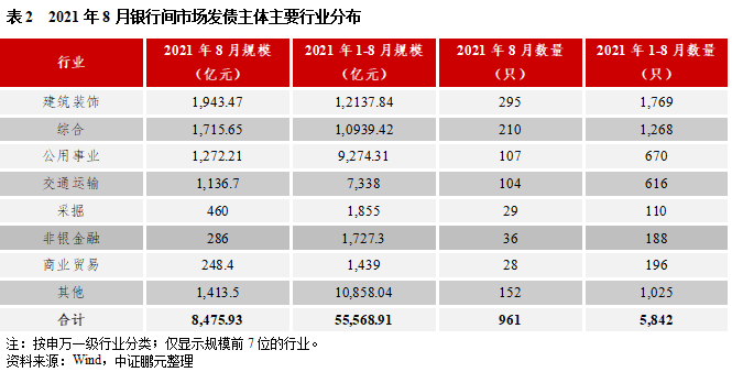 行業(yè)方面,建筑裝飾業(yè)和綜合業(yè)是8月銀行間市場(chǎng)債券發(fā)行的主力行業(yè)。