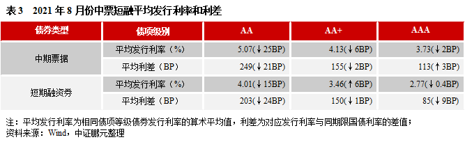 2021年8月份,中期票據(jù)的最高發(fā)行利率為7.50%,與上月最高發(fā)行利率持平;最低發(fā)行利率為2.8%,比上月最低發(fā)行利率下降10BP。與2021年7月份相比,AA級(jí)、AA+級(jí)別、AAA級(jí)的平均發(fā)行利率分別下降25BP、下降6BP和下降2BP;平均利差分別收窄21BP、收窄2BP和擴(kuò)大3BP。8月份短期融資券的最高發(fā)行利率為7.3%,比上月最高發(fā)行利率下降30BP;最低發(fā)行利率為2.00%,與上月最低發(fā)行利率持平。就短期融資券發(fā)行級(jí)別來(lái)看,AA級(jí)、AA+級(jí)別、AAA級(jí)的平均發(fā)行利率分別下降15BP、上升6BP和下降0.4BP;平均利差分別收窄24BP、1BP、9BP。