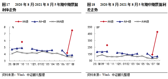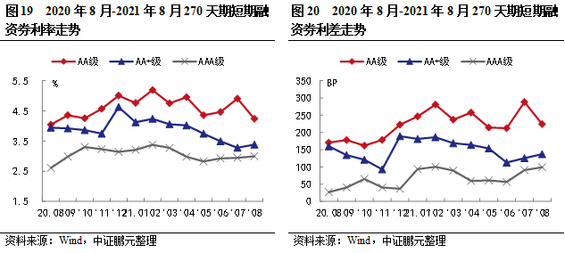就主要期限品種270天期短期融資券利率和利差走勢(shì)來(lái)看,2021年8月,AA級(jí)、AA+級(jí)和AAA級(jí)短融平均發(fā)行利率分別下行67BP、上行11BP和上行5BP。利差方面AA級(jí)、AA+級(jí)和AAA級(jí)短期融資券平均發(fā)行利差分別收窄64BP、擴(kuò)大12BP和擴(kuò)大8BP。AA級(jí)別利率變動(dòng)幅度最大,利率下行16BP,AA級(jí)別利差變動(dòng)幅度最大,利差收窄64BP。綜合1-8月利率利差走勢(shì)情況來(lái)看,短融利率波動(dòng)下行,利差漲跌互現(xiàn)。