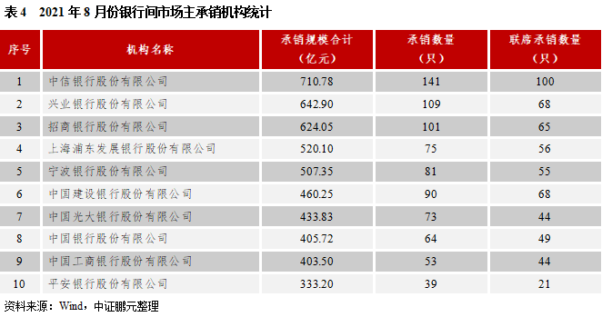 就承銷(xiāo)機(jī)構(gòu)而言,2021年8月共有60家機(jī)構(gòu)參與了銀行間市場(chǎng)的承銷(xiāo)工作。就承銷(xiāo)規(guī)模而言,中信銀行以710.78億元的承銷(xiāo)規(guī)模位居榜首,興業(yè)銀行以642.9億元位居第二,招商銀行以624.05億元的承銷(xiāo)規(guī)模位居第三。就承銷(xiāo)數(shù)量而言,中信銀行以承銷(xiāo)141只排名第一,興業(yè)銀行以承銷(xiāo)109只位列第二。在證券公司類(lèi)承銷(xiāo)機(jī)構(gòu)中,8月中信建投證券、華泰證券和中信證券的承銷(xiāo)規(guī)模位居前三,承銷(xiāo)額分別為249.07億元 、108.22億元和98.83億元。從承銷(xiāo)機(jī)構(gòu)集中度來(lái)看,承銷(xiāo)規(guī)模排名前十的主承銷(xiāo)商合計(jì)規(guī)模占比達(dá)到56.85%,集中度相對(duì)較高。與2021年7月相比,承銷(xiāo)機(jī)構(gòu)數(shù)量上升,集中度略有下降。