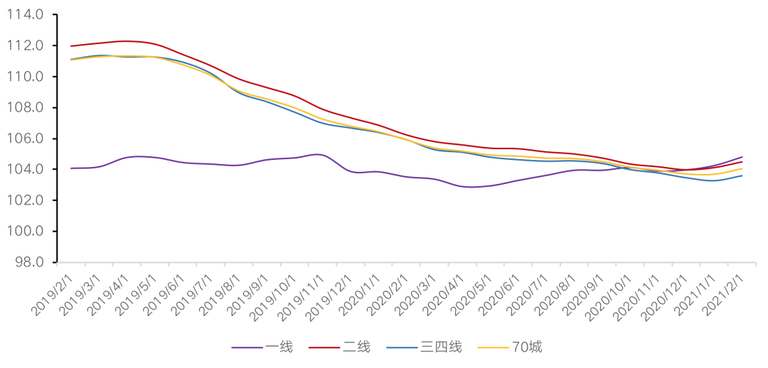 2021年前2月,全國(guó)新房銷(xiāo)售價(jià)格呈現(xiàn)同比上漲趨勢(shì),漲幅趨于平穩(wěn)。各能級(jí)環(huán)比漲幅有升有降,其中一線城市環(huán)比漲幅最高。具體來(lái)說(shuō),一線城市新建商品住宅銷(xiāo)售價(jià)格環(huán)比上漲0.5%,漲幅比上月回落0.1個(gè)百分點(diǎn);二線城市上漲0.4%,漲幅與上月持平;三線城市環(huán)比上漲0.3%,漲幅比上月擴(kuò)大0.1個(gè)百分點(diǎn)。