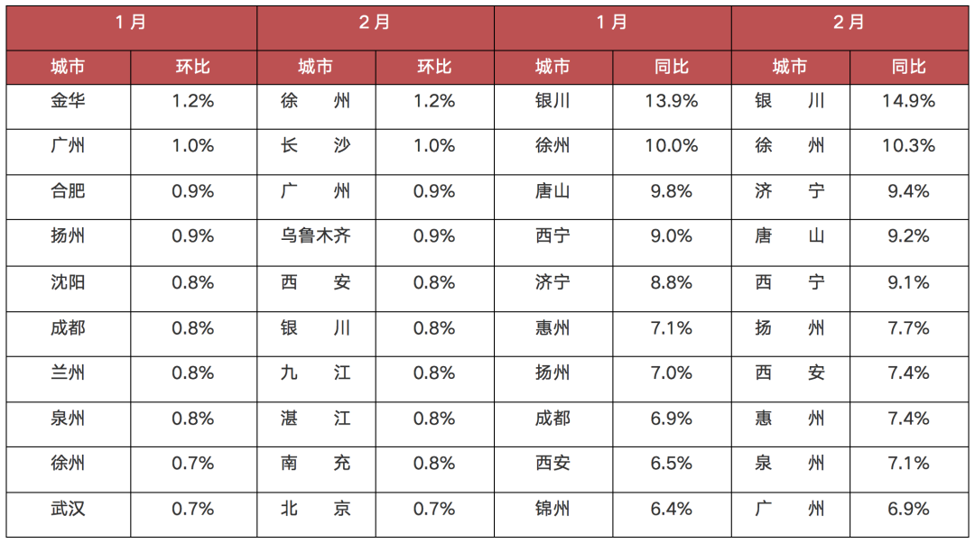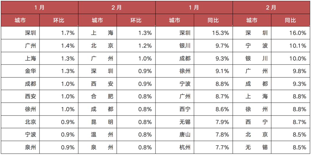 具體城市而言,我們通過(guò)對(duì)70個(gè)重點(diǎn)城市自去年2月以來(lái)的新房、二手房房?jī)r(jià)走勢(shì)進(jìn)行梳理發(fā)現(xiàn),銀川以14.9%的漲幅領(lǐng)漲新建商品住宅價(jià)格,其次為徐州;深圳二手房?jī)r(jià)漲幅高達(dá)16%,排名70城首位,寧波位居第二。