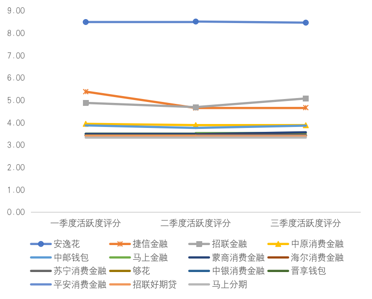 零壹智庫綜合對比15款APP第一二三季度活躍度的評分發(fā)現(xiàn),安逸花、招聯(lián)金融、捷信金融APP的地位相對而言較為穩(wěn)定,始終位于前三。