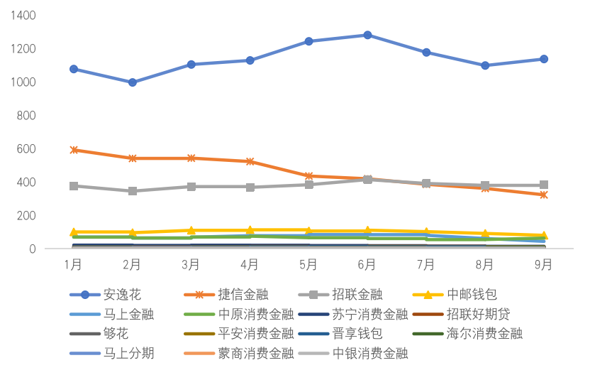 截至目前,我國已成立持牌消費金融公司30家,行業(yè)市場份額較為集中。整體來看,多數(shù)消費金融APP在上半年月活用戶數(shù)有所上升,下半年由于監(jiān)管趨嚴,行業(yè)場景收縮,對部分涉及該場景的公司造成一定影響,月活躍用戶數(shù)量有所波動。