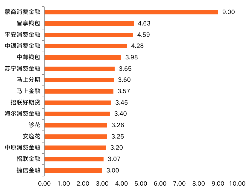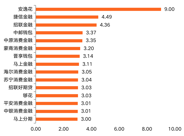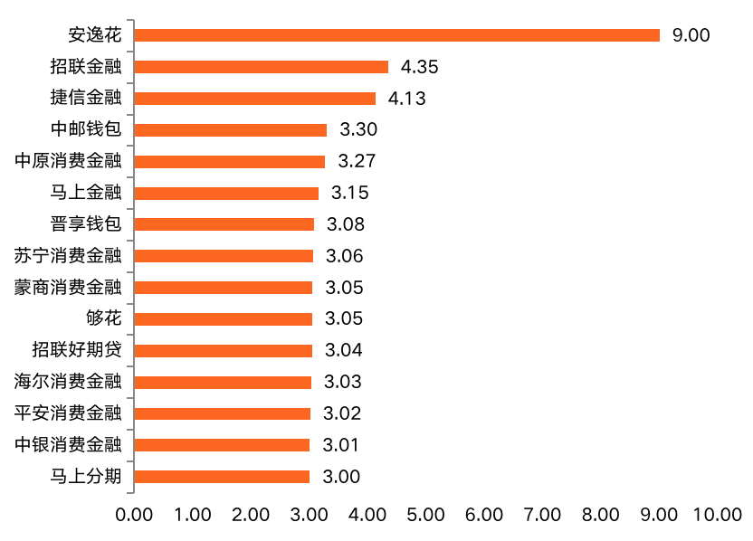 從日均活躍用戶的評分來看,安逸花APP表現(xiàn)最為突出,為9分;招聯(lián)金融APP和捷信消費金融APP分別為第二名(4.35分)和捷信消費金融(4.13分),其他消費金融APP均在3分左右。