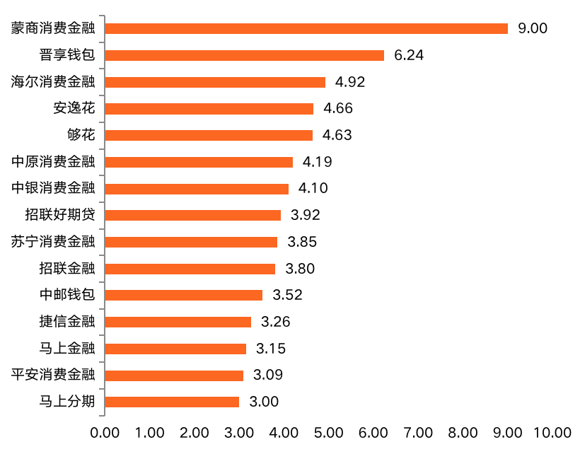 人均單日使用時長一定程度上可以反映用戶依賴程度。蒙商消費金融APP位列第一,得9分,優(yōu)勢明顯;第二名至第四名均在4-5分之間浮動,5-15名在3-4分之間浮動。