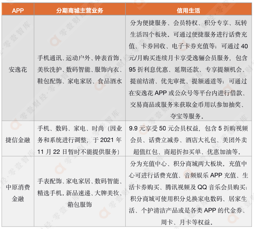 在分期商城方面,安逸花、捷信金融APP和中原消費金融APP的分期商城都有銷售手機、數(shù)碼、家電和服飾,安逸花APP中的產(chǎn)品種類更加齊全一些;捷信金融APP的分期商城因業(yè)務和系統(tǒng)進行調(diào)整,于2021年11月22日暫時不能提供服務。