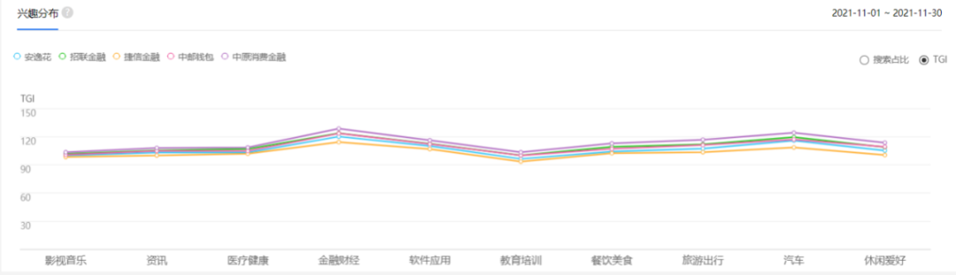整體上男性使用者多于女性使用者,而用戶的興趣偏好分布主要集中于金融財經(jīng)、軟件應用、汽車、醫(yī)療健康、教育培訓、餐飲美食、 旅游出行、影視音樂、資訊、休閑愛好等多個領域。
