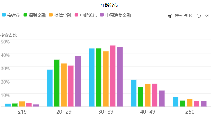用戶畫像反映了關注消費金融APP的用戶的年齡、性別和興趣分布。根據(jù)百度指數(shù)總結(jié)的用戶畫像可以看出,無論從年齡分布,還是性別、興趣分布來看,整體五款 APP 的用戶偏好相近,較為同質(zhì)化。