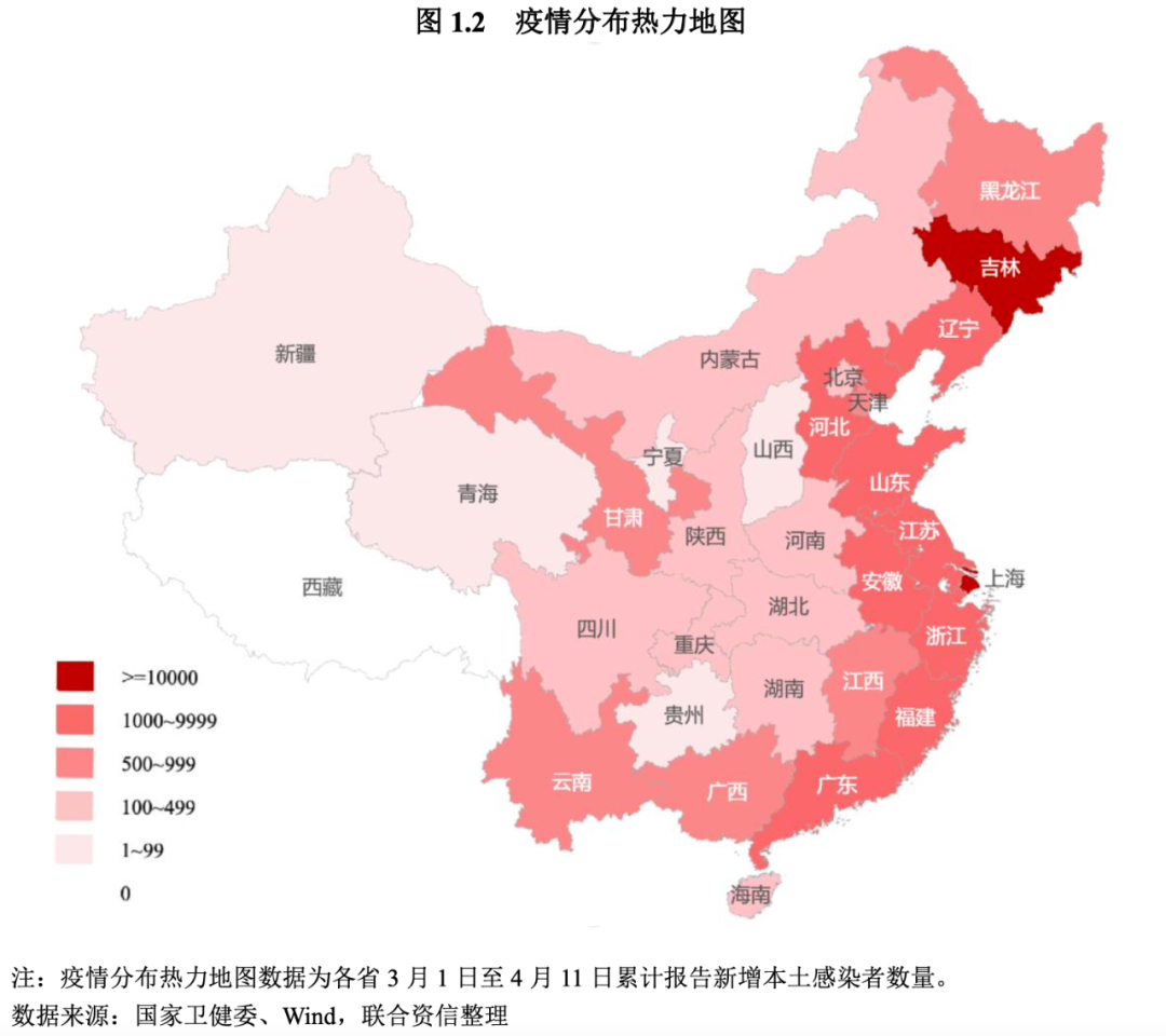 本輪疫情波及了全國大部分省市地區,影響范圍更廣。本輪疫情目前已經波及全國30個省市地區,近90%感染者來自于上海市和吉林省。其中,上海市3月1日至4月11日期間累計報告本土感染者超過30萬例,4月7日以來每天新增感染者超過2萬例,疫情尚未出現明顯拐點,防控形勢十分嚴峻。此外,上海疫情已經外溢到多省市,江蘇、浙江以及安徽近日以來新增感染者數量呈現上升態勢(見表1.1),上海周邊省市防控壓力明顯上升。吉林省3月1日至4月7日期間累計報告本土感染者超過6萬例,主要集中在長春市和吉林市,兩市2021年GDP占全省比重接近三分之二,對吉林省整體經濟的影響較大。前期疫情較為嚴重的深圳、山東,在實施嚴格的封閉式管理后,近期疫情已經趨于平緩,逐步恢復正常生產生活秩序。