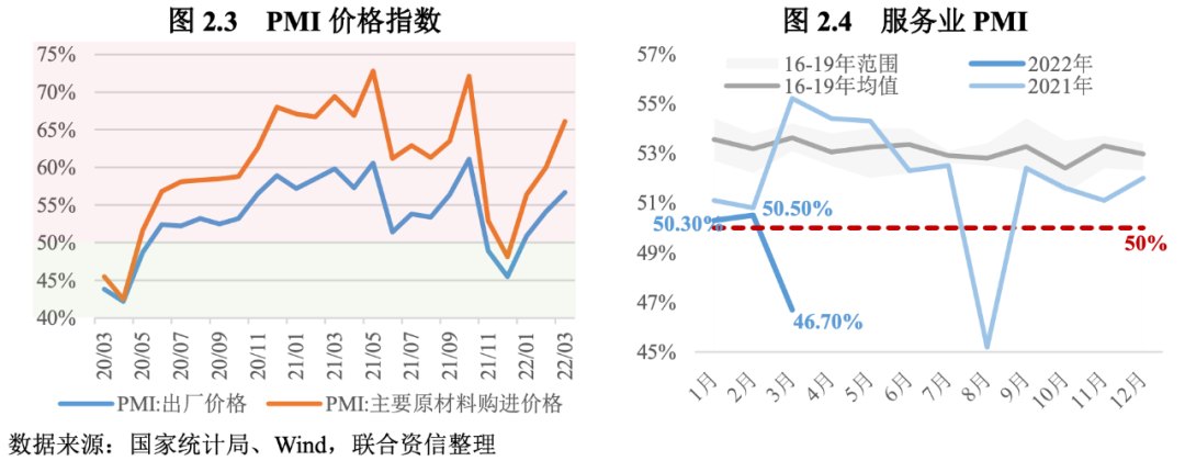 在輸入性通脹壓力抬升的背景下,國內供應鏈受阻或進一步推升原材料價格上漲,企業成本端承壓。在輸入性通脹和疫情防控對供應鏈的抑制作用下,3月制造業主要原材料購進價格指數和出廠價格指數分別達到66.1%和56.7%,分別高于上月6.1和2.6個百分點。價格上漲也導致企業生產經營活動預期指數下滑。在內需收縮和外需下滑的背景下,價格走高造成企業成本壓力增大,中下游制造業企業經營和財務狀況繼續承壓。