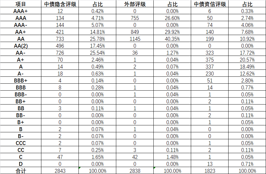 中債隱含評級主要評級區間在【AA-,AAA】6檔,集中在AA-、AA(2)、AA;