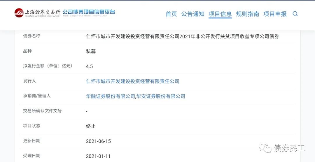 1、扶貧專項債。仁懷市城市開發建設投資經營有限責任公司2021年非公開發行扶貧項目收益專項公司債券,擬發行金額4.5億元,申報時間為2021年1月11日,終止時間為2021年6月15日。
