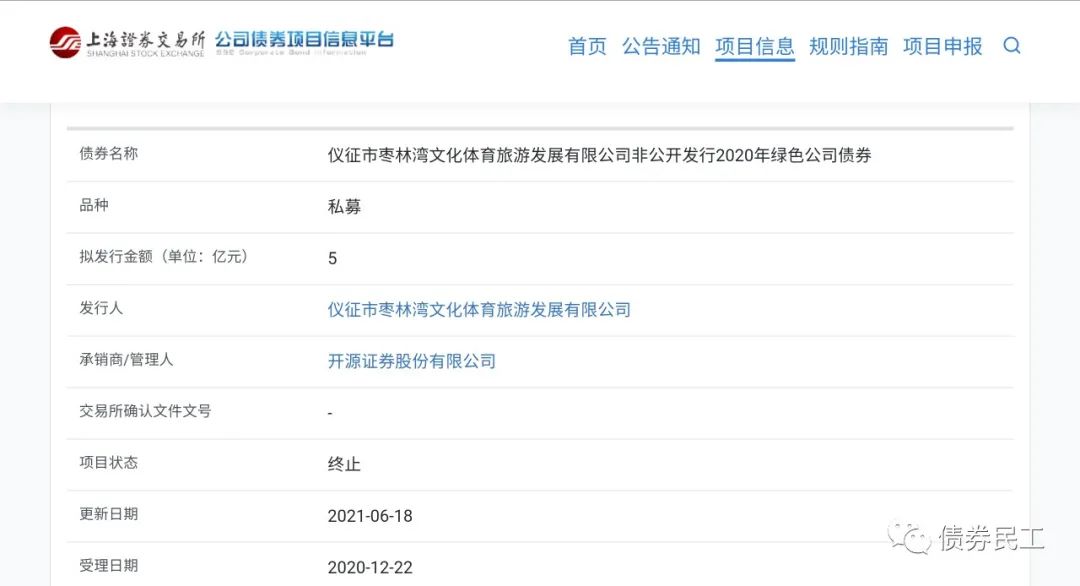 3、綠色公司債券。儀征市棗林灣文化體育旅游發展有限公司非公開發行2020年綠色公司債券,擬發行金額5億元,申報時間為2020年12月12日,終止時間為2021年6月18日。