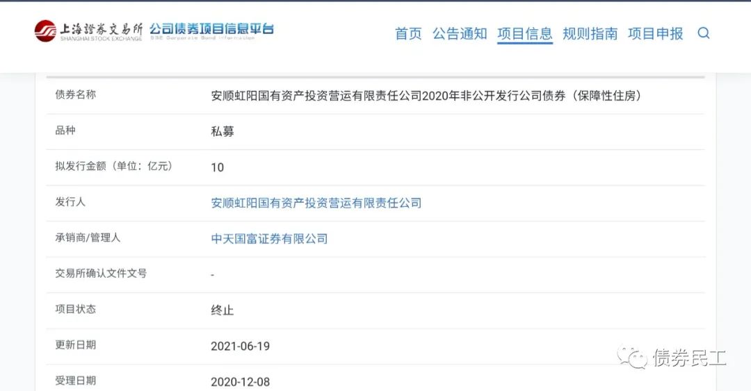6、保障性住房公司債券。安順虹陽國有資產投資營運有限責任公司2020年非公開發行公司債券(保障性住房),擬發行金額10億元,申報時間為2020年12月8日,終止時間為2021年6月19日。
