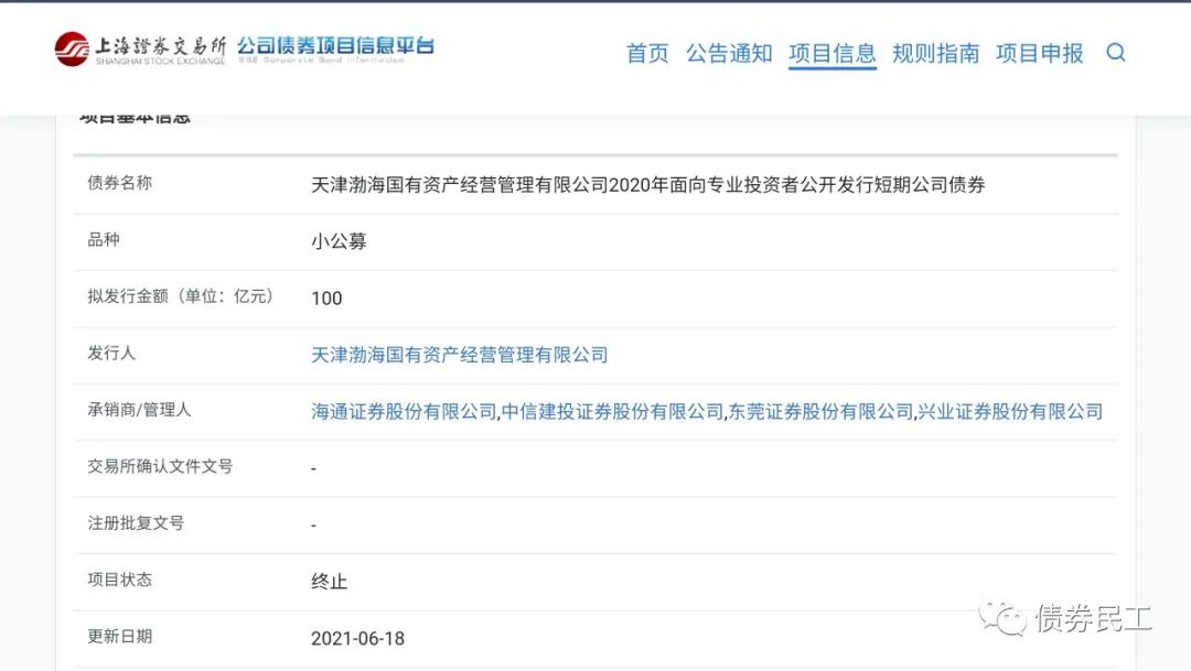 4、短期公司債券。天津渤海國有資產經營管理有限公司2020年面向專業投資者公開發行短期公司債券,擬發行金額100億元,申報時間為2020年12月15日,終止時間為2021年6月18日。