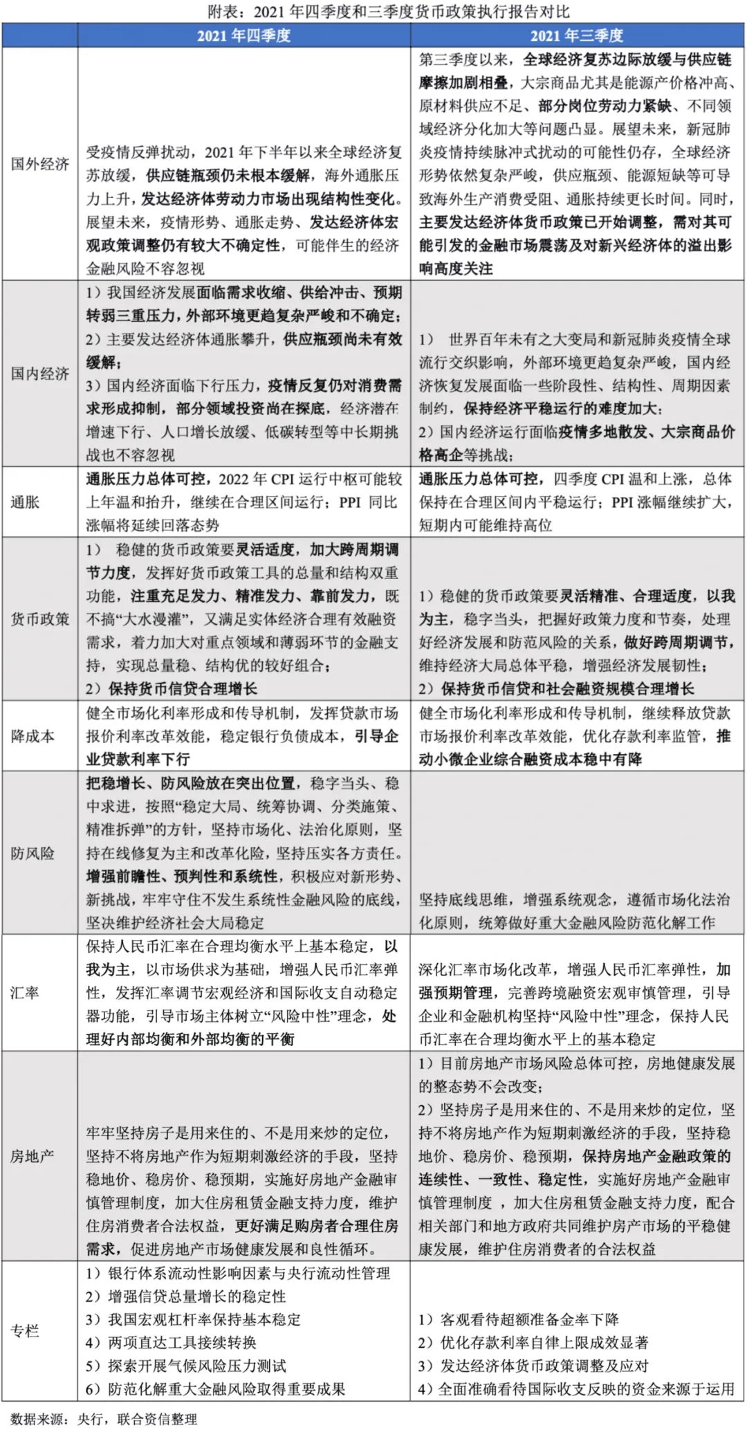 宏觀經(jīng)濟(jì)方面,強(qiáng)化了國內(nèi)經(jīng)濟(jì)下行的壓力,外部環(huán)境更趨嚴(yán)峻和不確定。國內(nèi)經(jīng)濟(jì),相較三季度,四季度報告強(qiáng)化了國內(nèi)經(jīng)濟(jì)的下行壓力,沿用了中央經(jīng)濟(jì)工作會議的表述“當(dāng)前我國經(jīng)濟(jì)發(fā)展面臨需求收縮、供給沖擊、預(yù)期轉(zhuǎn)弱三重壓力,外部環(huán)境更趨復(fù)雜嚴(yán)峻和不確定”,同時認(rèn)為“疫情反復(fù)仍對消費需求形成抑制,部分領(lǐng)域投資尚在探底”。從高頻數(shù)據(jù)看,2022年春節(jié)期間的餐飲消費、電影票房、旅游出行等較疫情前尚有一定的修復(fù)空間,顯示疫情對消費的影響尚未消除。海外經(jīng)濟(jì),央行指出當(dāng)前外部環(huán)境更趨復(fù)雜嚴(yán)峻和不確定,疫情、通脹和發(fā)達(dá)經(jīng)濟(jì)體貨幣政策調(diào)整仍是全球經(jīng)濟(jì)的三大不確定性,可能伴生的經(jīng)濟(jì)金融風(fēng)險不容忽視。通脹方面,認(rèn)為國內(nèi)通脹壓力總體可控:CPI運行中樞可能較上年溫和抬升,繼續(xù)在合理區(qū)間運行;PPI同比漲幅將延續(xù)回落態(tài)勢。全球高通脹持續(xù)時長尚存爭議,需防止通脹預(yù)期脫錨風(fēng)險。整體看,央行更加關(guān)注外部環(huán)境對我國可能產(chǎn)生的影響,同時在面臨經(jīng)濟(jì)下行壓力的情況下,央行將采取更加積極的政策,國內(nèi)通脹不會成為掣肘貨幣政策實施的因素。