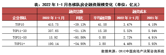 企業表現:本月融資總量最高的企業為萬科地產,融資總量約124.16億元,主要是發行了30億元的中期票據,此外進行了資產證券化產品的發行。從企業梯隊來看,2022年1月TOP10房企融資平均額41.58億元最大,融資總額同比下降39.13%,下降幅度最小;TOP31-50房企融資額僅有15.92億元,該梯隊進行融資的企業相對較少。成本來看,TOP31-50梯隊的房企融資成本最低,為2.72%,其較2021年全年下降2.19pct,降幅最大;而TOP11-30的融資成本最高,為5.52%。