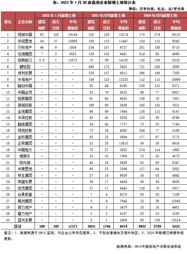 2022年開年首月,30家監測房企土地投資處于低位,新增土地成交建面、總價相比2021年及2020年年均都有大幅收窄,受投資結構等影響,平均樓板價11371元/平方米。本月30家典型房企新增土儲總建面169萬平方米,環比下降87%;新增土地成交價格192億元,環比下降83%。平均樓板價11371元/平方米,與上月相比上升30%。主要由于投資量少且相對集中,拉高整體平均樓板價。