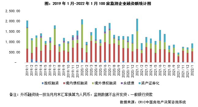 融資總量:2022年1月100家典型房企的融資總量為929.46億元,環比上升26%,同比下降56%。自2019年以來,每年年初房企融資量都相對較大,均超過2000億元,而本月融資量不足千億元,一方面在當前房企危機仍未全面解除的情況下,金融機構當前白名單企業相對較少,放款較為謹慎;另一方面,部分企業為緩解年初的償債壓力已提前償還部分債券,同時減少新增融資計劃,導致融資量同比下滑較大。從融資結構來看,境內債權融資499.08億元,環比上升9.8%,同比下降24.6%;境外債權融資169.66億元,環比上升10.0%,同比下降80.1%;本月資產證券化有所回升,融資223.01億元,環比上升97.9%,同比下降63.0%。