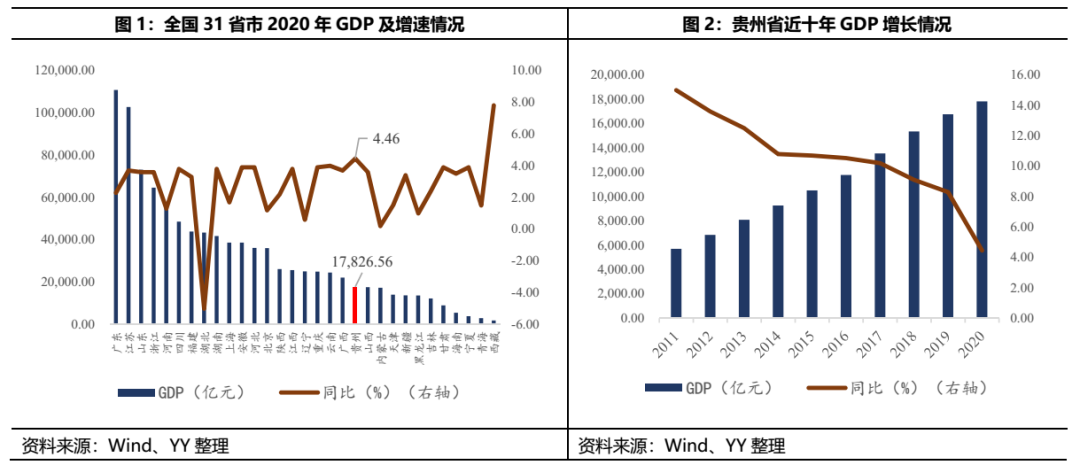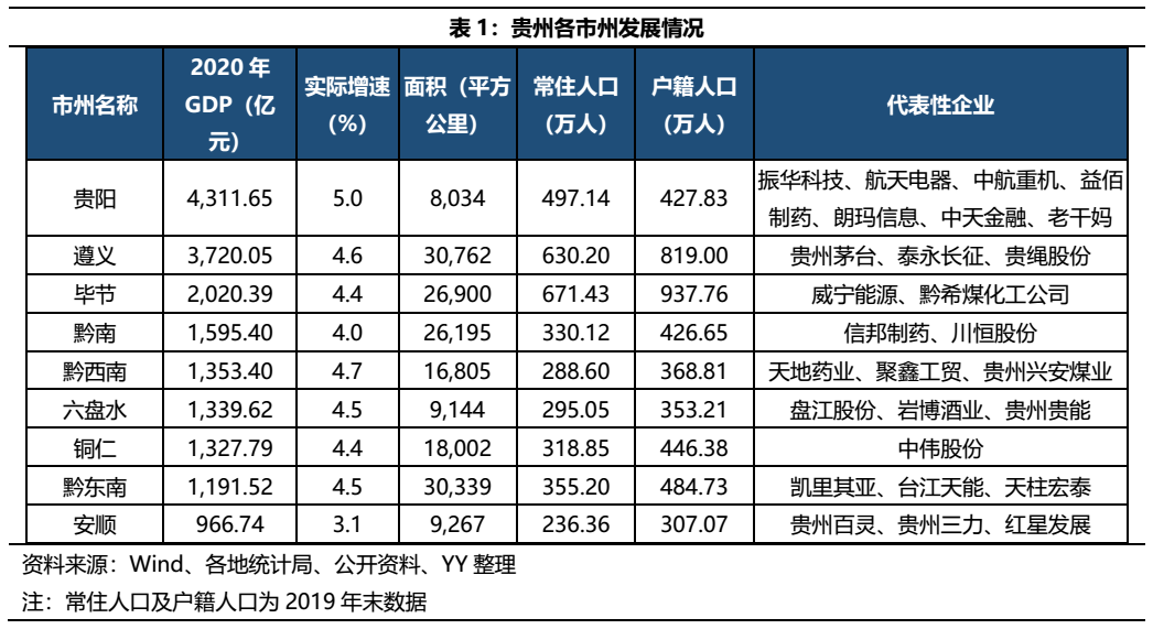 貴州地處我國(guó)西南腹地,北接川渝,東毗湖南、南鄰廣西、西連云南,截至2020年末,全省公路通車?yán)锍?0.67萬(wàn)公里,實(shí)現(xiàn)了“縣縣通高速”,全年全省鐵路、公路、水運(yùn)貨物運(yùn)輸總量86,444.63萬(wàn)噸、旅客運(yùn)輸總量40,136.73萬(wàn)人,民航旅客吞吐量2,253.16萬(wàn)人次,是我國(guó)西南地區(qū)交通樞紐。貴州地貌素有“八山一水一分田”之說(shuō),全省面積中92.5%為山地及丘陵,這也是造成歷史上貴州經(jīng)濟(jì)發(fā)展緩慢的原因之一。不過(guò)貴州自然資源稟賦強(qiáng),汞、磷、鋁土礦、煤炭等礦產(chǎn)資源、水資源以及生物資源儲(chǔ)量豐富。目前貴州省轄6個(gè)地級(jí)市、3個(gè)自治州,2019年末常住人口3,622.95萬(wàn)人,城鎮(zhèn)常住人口占49.02%,戶籍人口4,571.45萬(wàn)人,城鎮(zhèn)化進(jìn)程相對(duì)滯后且人口流出嚴(yán)重。