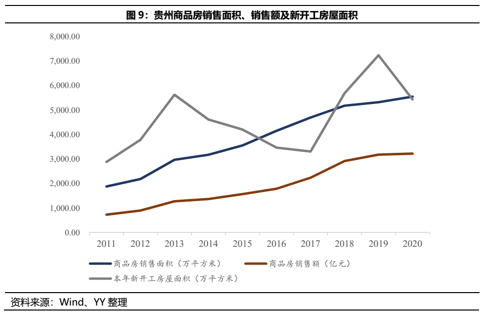 不過(guò)從新開(kāi)工面積和土地成交情況來(lái)看,2020年貴州全省房屋新開(kāi)工面積5,441.06萬(wàn)平方米,同比下降24.8%,降幅較前三季度均擴(kuò)大;2020年貴州房開(kāi)企業(yè)土地購(gòu)置面積348.57萬(wàn)平方米,比上年減少34.8%,降幅較前三季度擴(kuò)大,全年土地成交價(jià)款同比減少17.9%,降幅較前三季度也呈擴(kuò)大態(tài)勢(shì)。新開(kāi)工面積與土地成交呈現(xiàn)高位負(fù)增長(zhǎng)態(tài)勢(shì),且降幅隨季度擴(kuò)大,表明疫情這一短期沖擊因素并非主因,而是開(kāi)發(fā)商拿地及開(kāi)盤意愿有所減弱,可能是受銷售市場(chǎng)回升緩慢及融資端受鉗制等原因影響。地產(chǎn)市場(chǎng)后勁不足,對(duì)于土地財(cái)政依賴程度較高的貴州省來(lái)說(shuō)將可能引發(fā)連鎖反應(yīng),后續(xù)需持續(xù)關(guān)注貴州地產(chǎn)市場(chǎng)的走勢(shì)。
