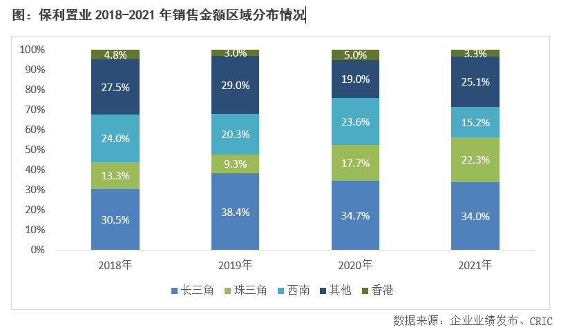 在城市能級(jí)方面,保利置業(yè)近兩年加大在三四線城市的布局,占比自2019年以來連年攀升,2021年占比達(dá)到30.9%,同比增長9.4個(gè)百分點(diǎn),同時(shí)也加大在一線城市的布局,2021年一線城市的占比達(dá)到33.6%,同比上升18.1個(gè)百分點(diǎn)。而在區(qū)域布局方面,保利置業(yè)于長三角和珠三角區(qū)域拿地的建面占比最高,分別達(dá)到40%和37%,占比分別同比增長了9個(gè)百分點(diǎn)和18個(gè)百分點(diǎn)。