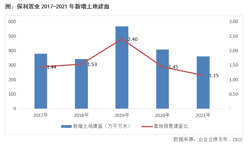 【拿地積極,聚焦長三角和珠三角區(qū)域】全年新增土地建面360.9萬平方米,權(quán)益拿地總價(jià)230億元。自2017年以來新增土地建面高于銷售建面,2021年達(dá)到1.15,拿地較為積極。在區(qū)域布局方面,保利置業(yè)于長三角和珠三角區(qū)域拿地的建面占比最高,分別達(dá)到40%和37%。