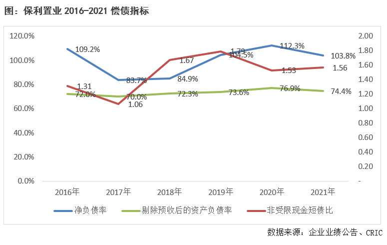 債務(wù)結(jié)構(gòu)的改善也助力企業(yè)杠桿水平的降低,2021年末凈負(fù)債率同比下降6.3個(gè)百分點(diǎn)至103.83%。剔除預(yù)收后的資產(chǎn)負(fù)債率也同比下降2.1個(gè)百分點(diǎn)至74.4%。整體來看,2021年末保利置業(yè)三條紅線指標(biāo)雖有所改善,但仍觸及兩條紅線,未來仍需進(jìn)一步加強(qiáng)。
