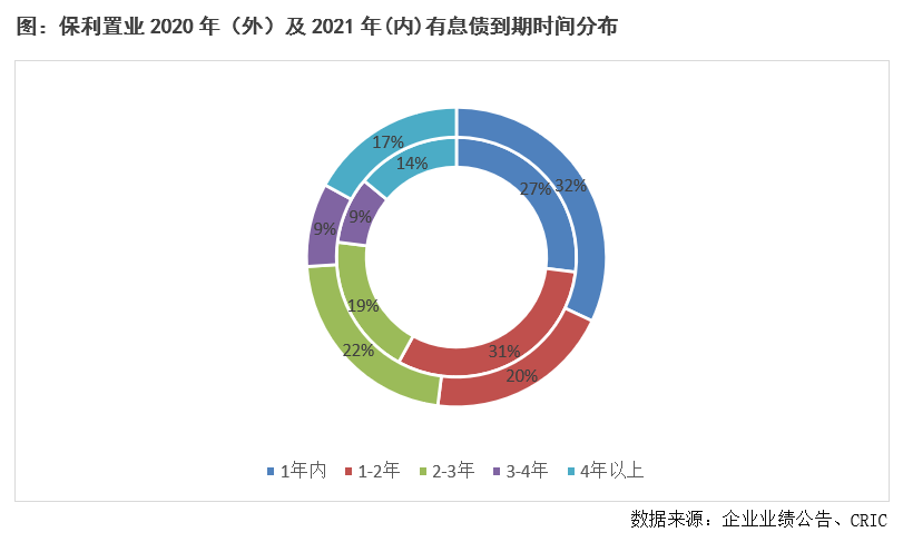 2021年末,保利置業(yè)持有現(xiàn)金較同比下降16.15%至366.02億港元,非受限現(xiàn)金短債比1.56,而2020年為1.53,現(xiàn)金短債比進(jìn)一步改善,短期償債壓力不大。而從債務(wù)期限來看,保利置業(yè)短債占比下降5個(gè)百分點(diǎn)至27%,債務(wù)結(jié)構(gòu)得到改善。