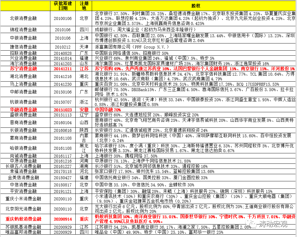 按批籌時間順序依次為北銀消費金融(北京銀行35.29%)、錦程消費金融(成都銀行38.86%)、蘇寧消費金融(南京銀行15%)、湖北消費金融(31.91%)、杭銀消費金融(杭州銀行41%)、盛銀消費(盛京銀行60%)、晉商消費金融(晉商銀行40%)、陜西長銀消費金融(長安銀行51%)、蒙商消費金融(蒙商銀行44.16%)、哈銀消費金融(哈爾濱銀行53%)、尚誠消費金融(上海銀行38%)、中原消費金融(中原銀行78.13%)、長銀五八消費金融(長沙銀行51%)、幸福消費金融(張家口銀行17.90%)、小米消費金融(重慶農(nóng)商行30%)、蘇銀凱基消費金融(江蘇銀行50.10%)。這其中有一家地方性銀行為農(nóng)商行,即重慶農(nóng)商行。