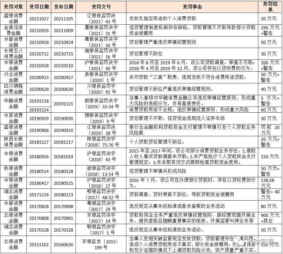 目前針對消費金融公司的監(jiān)管處罰案例已比較多,處罰事由多為違反審慎經(jīng)營規(guī)則、違反發(fā)放不符合用途的個人消費貸款等等。不過從處罰結(jié)果來看,超過100萬元的罰款案例并不多,因此在消費金融行業(yè)中,一旦處罰案例超過100萬元,則大概能說明該處罰和相應(yīng)的違規(guī)問題算是比較重了。