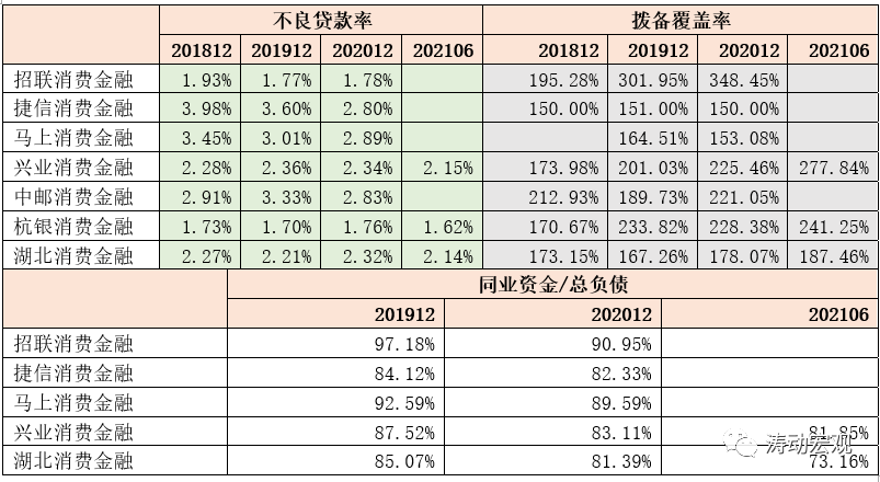 以2020年底為例,招聯(lián)消費金融、捷信消費金融、馬上消費金融、興業(yè)消費金融、中郵消費金融的不良貸款率分別達(dá)到1.78%、2.80%、2.89%、2.34%和2.83%,對應(yīng)的撥備覆蓋率分別為348.45%、150%、153.08%、225.46%和221.05%。