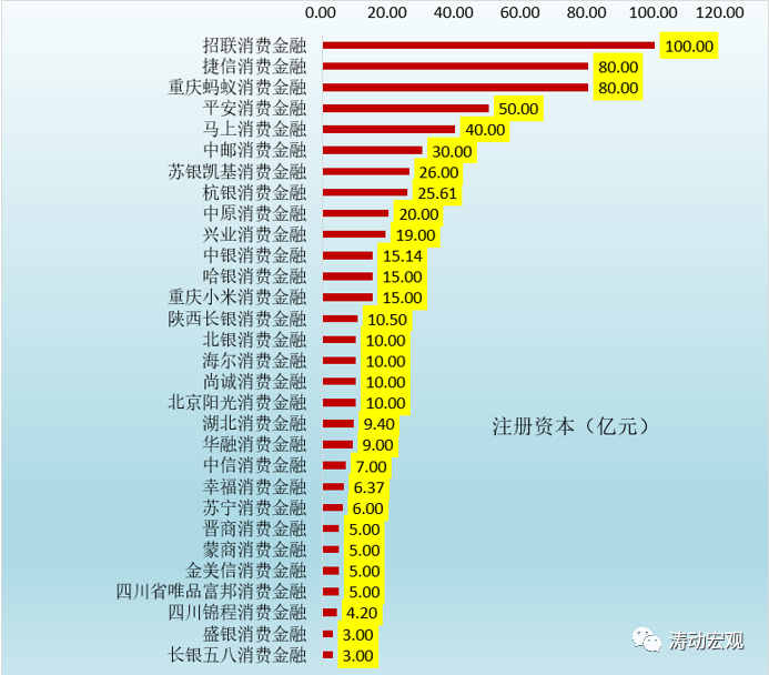2、目前合計有9家消費金融公司的注冊資本超過20億元(含),依次為招聯(lián)消費金融(100億元)、捷信消費金融(80億元)、螞蟻消費金融(80億元)、平安消費金融(50億元)、馬上消費金融(40億元)、中郵消費金融(30億元)、蘇銀凱基消費金融(26億元)、杭銀消費金融(25.61億元)以及中原消費金融(20億元)。