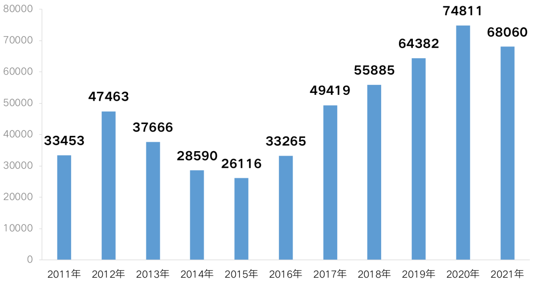 與土地成交規模變動走勢一致,成交金額同比亦呈下滑趨勢。據CRIC統計,2021年全國土地總成交金額達68060億元,同比2020下降了9%,扭轉了連續六年的漲勢。主要是因為兩集中新政實施后成交規模的大幅減少所致。