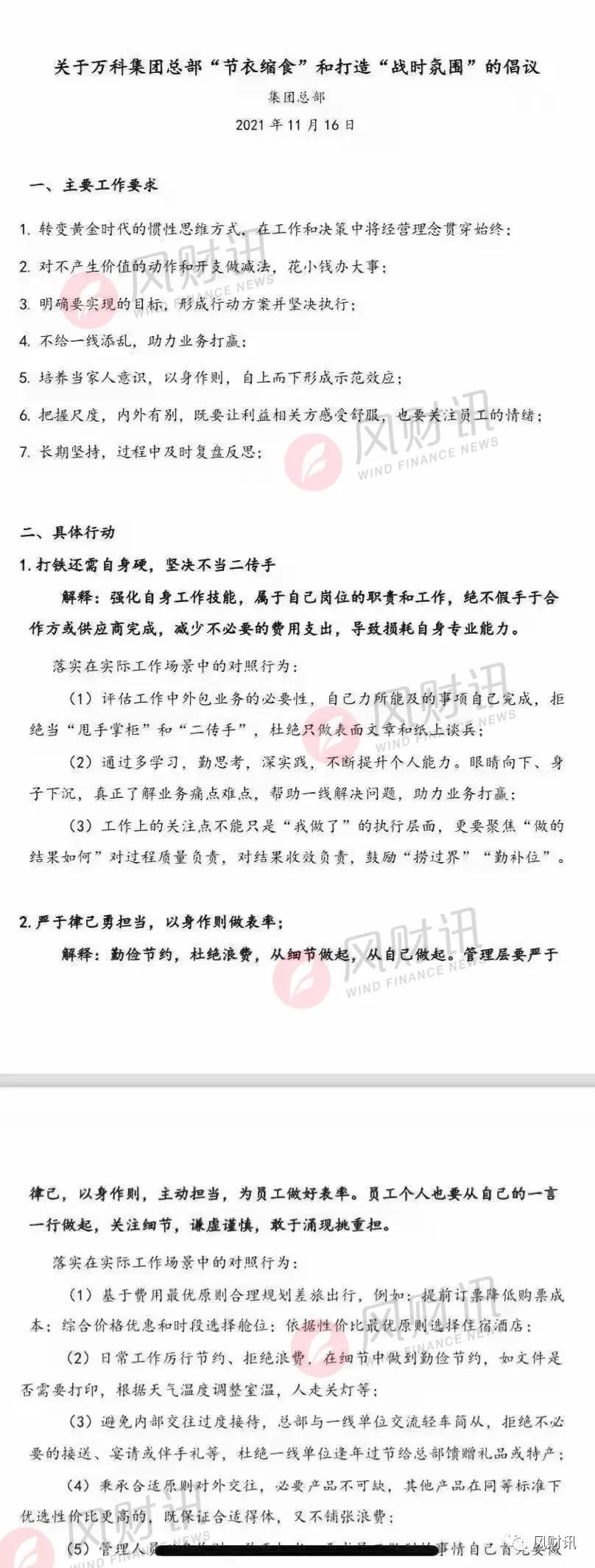 2021年11月16日,萬科集團總部下發了一份《關于萬科集團總部“節衣縮食”和打造“戰時氛圍”的倡議》。